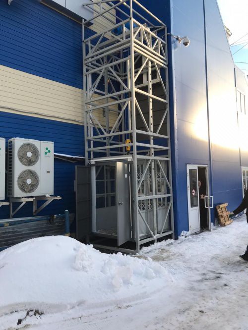 Подъемник изготовлен вместе с металлокаркасной шахтой. Высота подъема - 3 метра, грузоподъемность - 1000 кг.